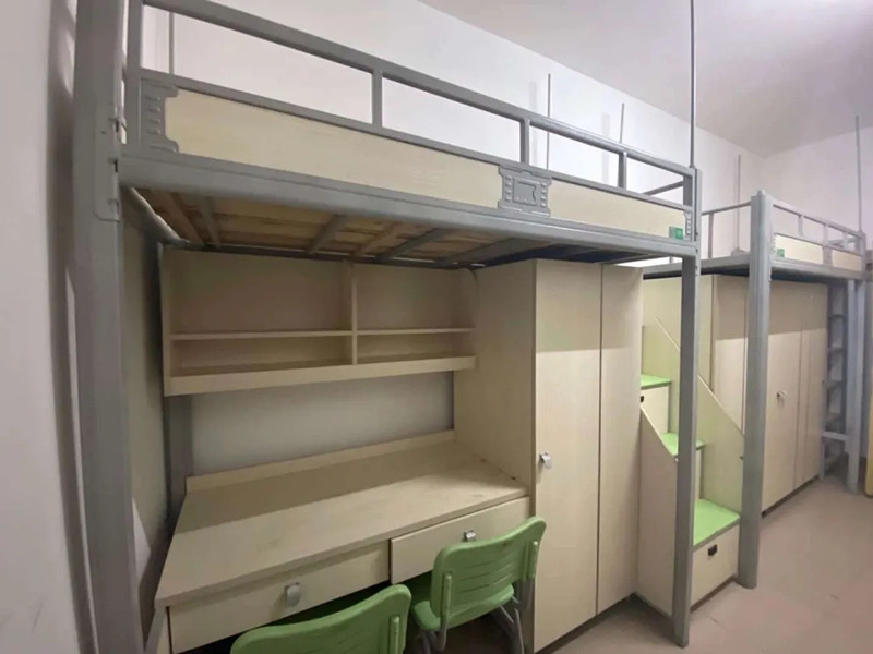 上铺楼梯进行了加宽处理并采用宽厚的木质材料以便于上下床,寝室里面没有任何尖角设计,安全贴心。学生书桌分别位于两边,一边是双人座,一边为三人座。这样的设计相较于一人一桌,更能促进室友之间的交流学习,仿佛身处教室上课般亲切。此外在走廊和楼梯转角处还配备了吹风机和自动饮料售卖机,一楼有一间洗衣房,内有洗衣机、烘干机、热水器等。