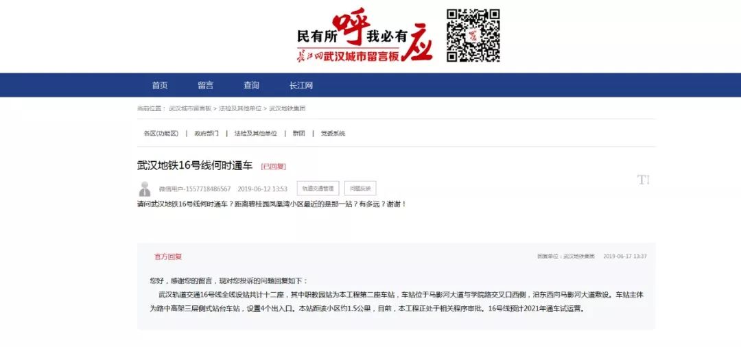 武汉地铁集团(6月4日回复):第四轮建设规划中,16号线属于市域快线,目前16号线已上报发改委待批,发改委批复及招标完成后全线开工建设。
