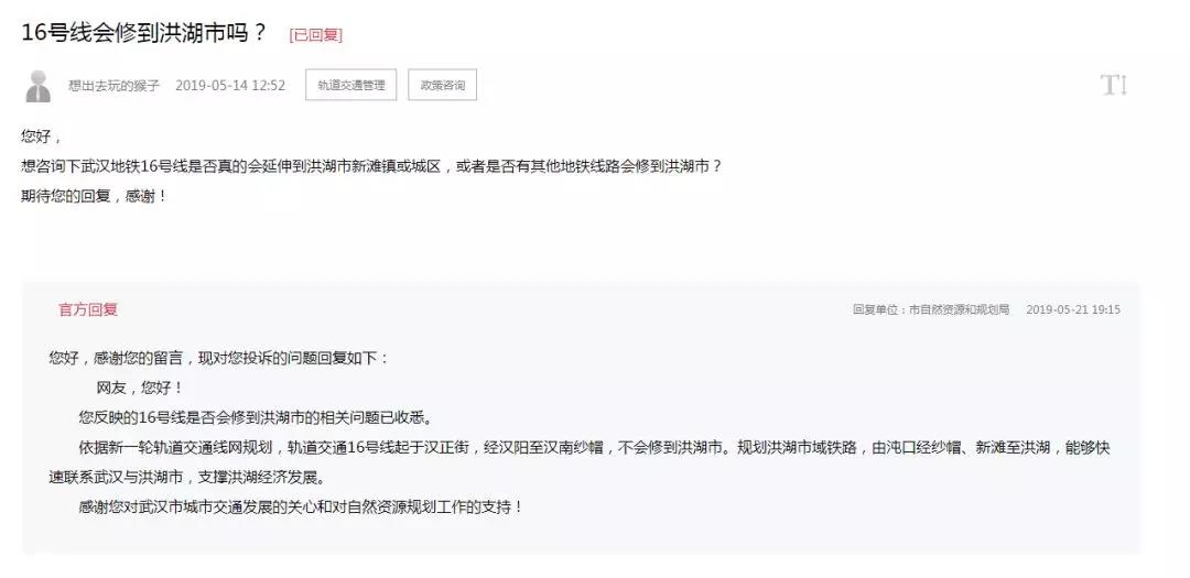 对此,市自然资源和规划局今年5月21日在城市留言板回应:依据新一轮轨道交通线网规划,轨道交通16号线起于汉正街,经汉阳至汉南纱帽,不会修到洪湖市。回复中提到,规划的洪湖市域铁路,由沌口经纱帽、新滩至洪湖,能够快速联系武汉与洪湖市。
