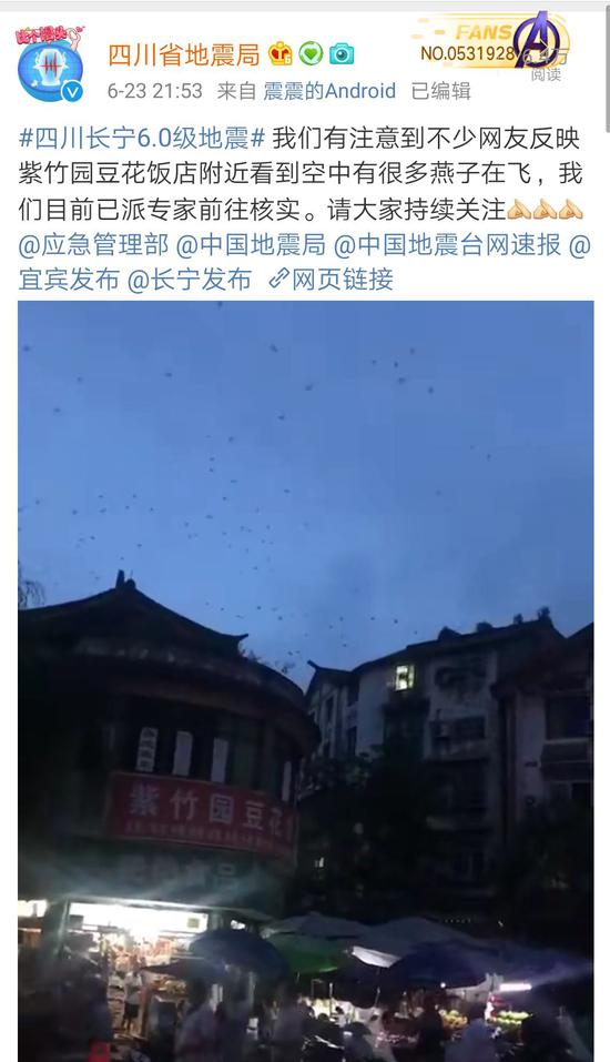对此,四川省地震局于当日晚间在官方微博做出回应,称:“我们有注意到不少网友反映紫竹园豆花饭店附近看到空中有很多燕子在飞,我们目前已派专家前往核实。请大家持续关注。”