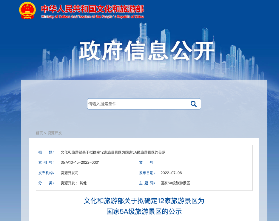 文旅部公示信息显示,经有关省(区、市)文化和旅游行政部门推荐,文旅部按程序组织综合评定,此次有12家旅游景区达到国家5A级旅游景区标准要求,拟确定为国家5A级旅游景区,现予公示。