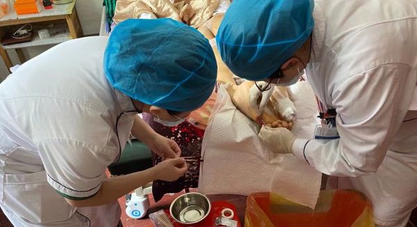这次,接到订单的是天佑医院伤口专业护士王艳和黄诗琪。她们发现两处伤口都属于压力性损伤,俗称压疮,伤口目前为Ⅳ期和深部组织损伤期。有了诊断结果,两名护士立即对伤口进行处理。她们半蹲在床边,弯腰弓背小心揭开黑痂,一点点去掉溃烂组织,原来溃烂竟已深可见骨。上药包扎好两侧伤口已是3小时过去。
