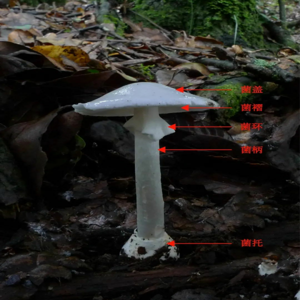 致命鹅膏:俗名“白毒伞”,菌体各部分均为白色,菌柄上部有白色膜质菌环(易脱落),菌柄基部球形或近球形,有菌托。致命鹅膏可以造成急性肝损害,是我国名副其实的“蘑界”头号毒王!