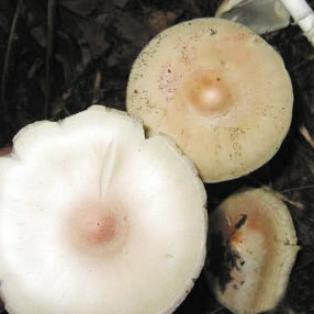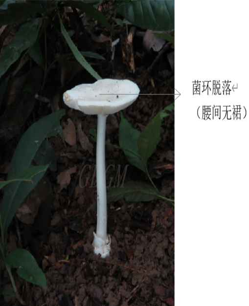淡红鹅膏:子实体几乎为全白色,菌盖扁平,中央有不明显的凸起,带有淡淡的粉红色,表面光滑,菌盖边缘无条纹。菌环白色,位置接近菌柄上部分,菌柄基部近球状,菌托浅杯状。可引起急性肝损害,是致死率极高的毒蘑菇。