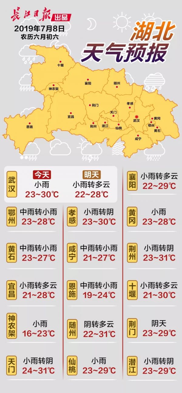 今起三天,武汉将以阵性降水天气为主,最高气温在30℃上下浮动。