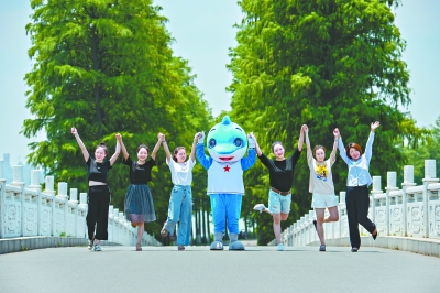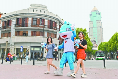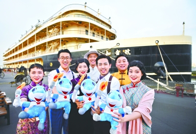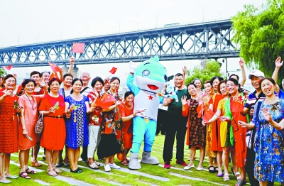 7日,在汉口江滩知音号游船前,演员们与“兵兵”一起祝福军运会 。长江日报记者郭良朔 摄