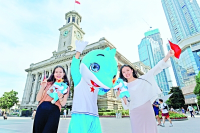 7日,在汉口江汉关,军运会吉祥物“兵兵”与市民合影。长江日报记者詹松 何晓刚 摄