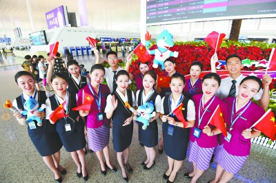 8日,在天河机场T3航站楼里,南航靓丽的工作人员与“兵兵”一起成为一道亮丽的风景。长江日报记者詹松 何晓刚 摄