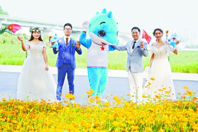 7日,在汉口江滩,两对新人与“兵兵”在一起 。长江日报记者何晓刚 詹松 摄