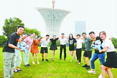 8日,光谷武汉未来科技城仿生态建筑马蹄莲下,一群朝气蓬勃的年轻创业者与“兵兵”开心合影。长江日报记者高勇 摄