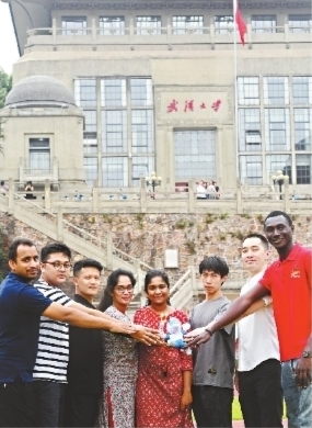 8日,在武汉大学,外国留学生为军运会加油。长江日报记者李子云 摄