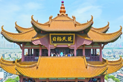 7日,“兵兵”和游客一起在黄鹤楼上欢迎八方游客的到来,为军运会加油助威 。长江日报记者胡九思 摄
