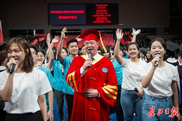 6月19日,华中科技大学毕业典礼上,校长李元元与近7000名本科毕业生一起合唱《我和我的祖国》 记者任勇 摄