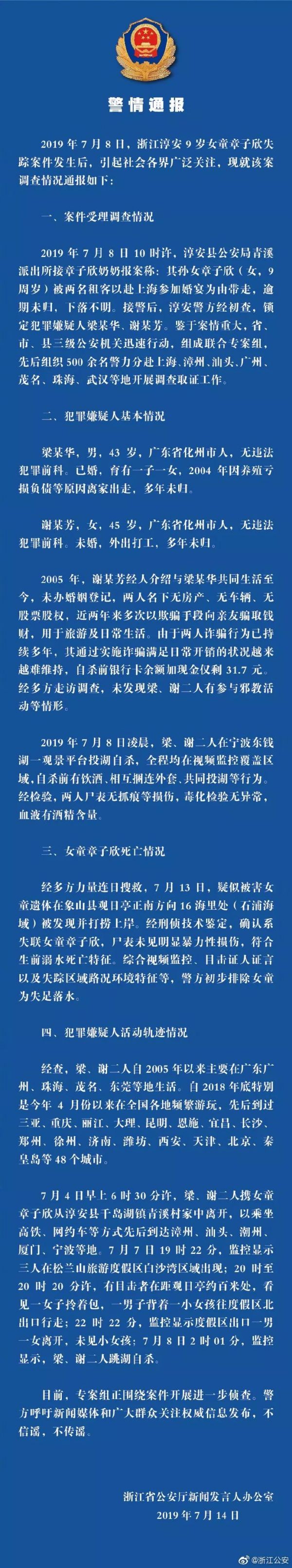 警方通报淳安失踪女童案件调查情况