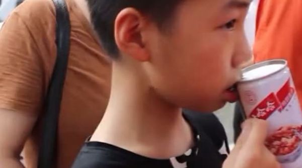 熊孩子被八宝粥罐卡住嘴唇