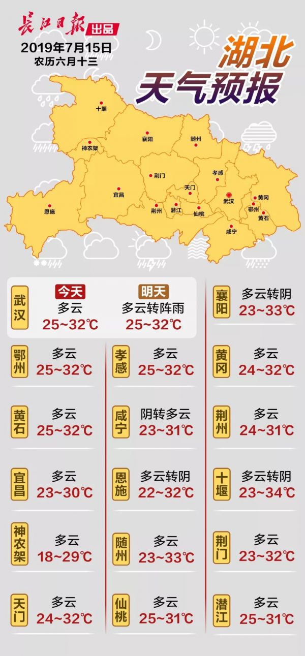 今晚起,武汉将迎来新一轮降雨。明天渡江节,天气多云转阵雨。由于目前已进入伏天,武汉整体气温呈上升趋势。
