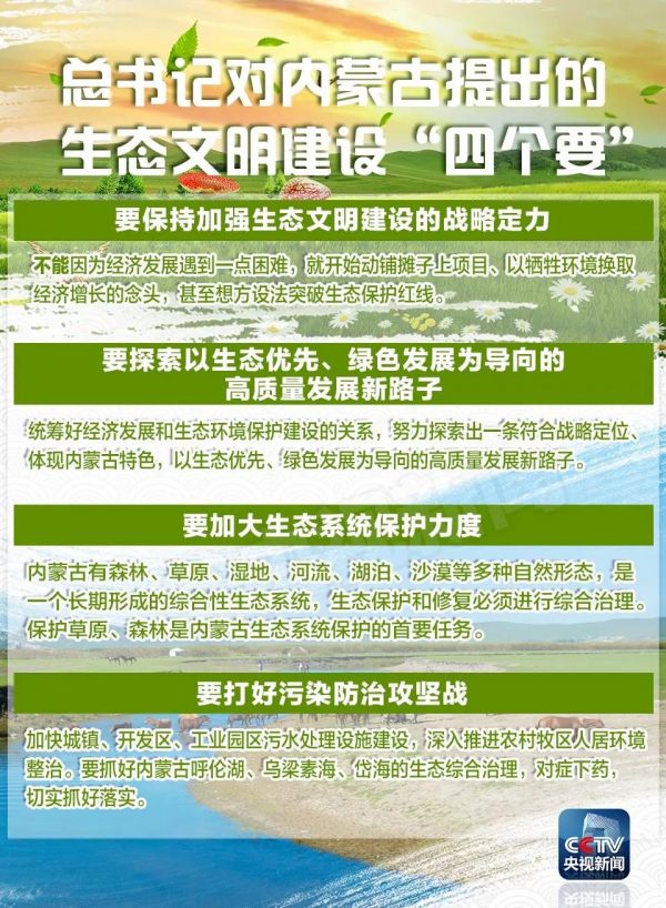 习近平始终关注着内蒙古的生态文明建设。2014年在内蒙古调研时,他就指出要“努力把内蒙古建成我国北方重要的生态安全屏障”;2018年两会,他参加内蒙古代表团审议时,提出“在祖国北疆构筑起万里绿色长城”。今年两会,他再次来到内蒙古代表团,强调内蒙古的生态建设“关系华北、东北、西北乃至全国生态安全”,并提出生态文明建设的“四个要”。