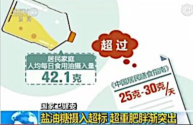 国家卫健委发布调查显示:我国居民人均每日食盐摄入量10.5克,远超世卫组织推荐的5克数值;家庭人均每日食用油摄入量42.1克,超膳食指南推荐的25-30克标准值。