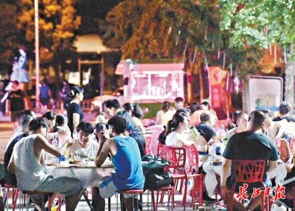 24日,夜幕降临,武汉三镇开启夜经济模式。图为常青花园商业街的 消夜场景 记者刘斌 摄