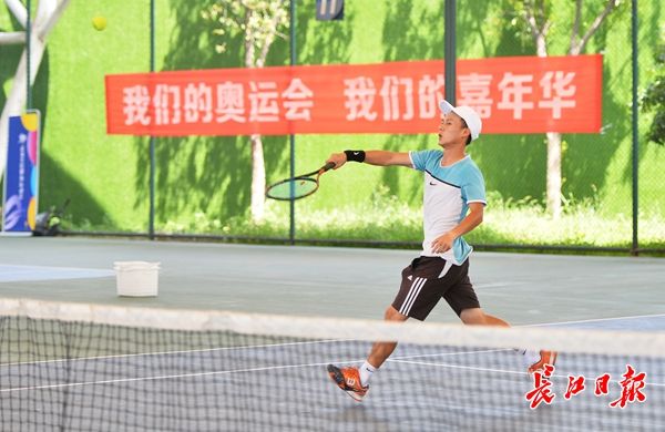 长江日报融媒体7月30日讯(记者朱文秀)“与军运同行”2019武汉全民健身运动会网球比赛的在32支球队中,航天宏图雄鹰队是最特殊的一支,球队8名参赛队员中,5人家在外地。