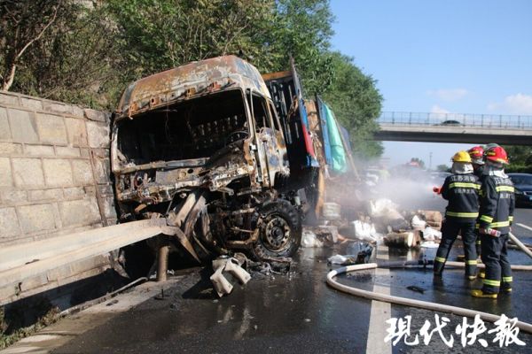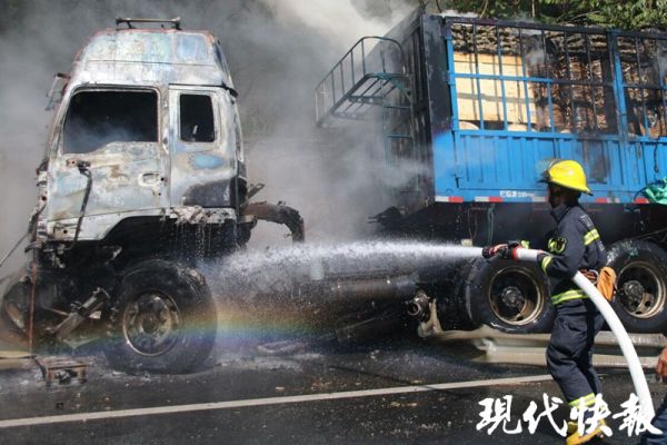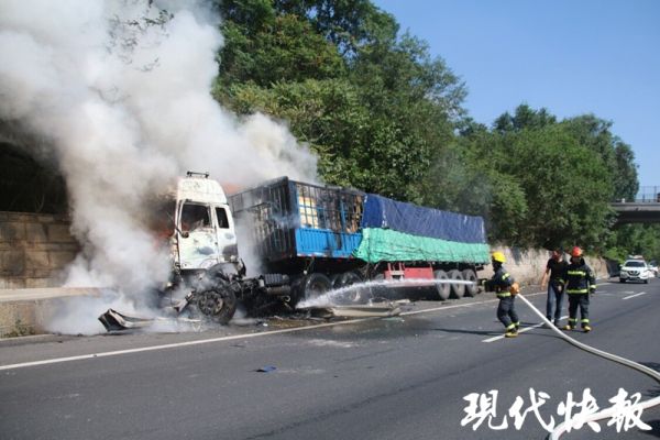 消防指战员到场后发现,一辆挂着河北牌照的半挂车车头正在熊熊燃烧,现场冒着浓烟,车厢里装载着滚筒的铁丝以及纸箱食品包装袋等物品,火势正在向车厢蔓延。消防指挥员立即下令,出两支水枪对车头和车身着火部位进行喷水灭火,防止油箱发生爆炸危险,并堵截火势继续扩大蔓延。高速交警对事故路段实行了临时交通管制。