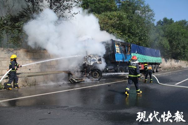 当天下午2时38分,连云港市消防指挥中心接到报警,位于G25长深高速连云港苍梧收费站往淮安方向约3公里处,一辆半挂车撞到高速护栏后,油箱起火燃烧,接到报警后,消防指战员立即赶往现场。