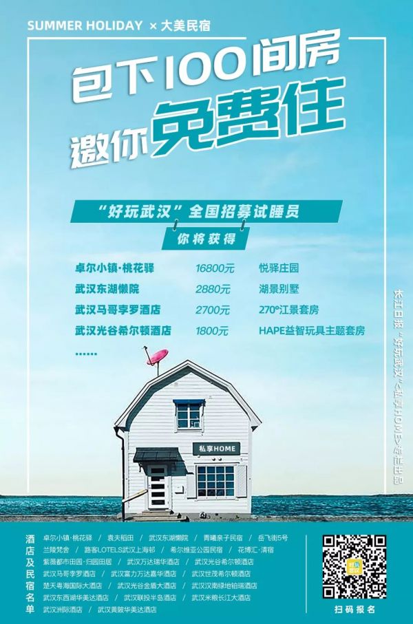 上周长江日报“好玩武汉”平台发起了100间“艺宿”免费睡的活动,面向全国招募100名试睡员目前招募正在火热进行中