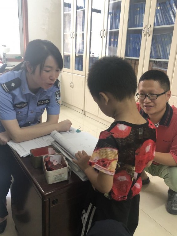 值班民警袁小丽把小男孩领到值班室内,耐心询问他的姓名及家人信息,可孩子因为在陌生环境,低着头什么也不肯说。