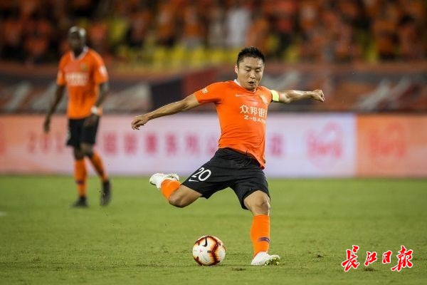 武汉卓尔队队长李行比赛中射门。 记者任勇 摄