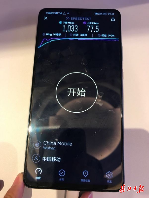 当日,胡先生在移动营业厅体验了5G的下载速度,“测速软件上显示的下载速率是1033Mbps,上传速率是77.5 Mbps”,胡先生一边测试一边吃惊地表示,“5G的网络速度实在太强大了”,随后,胡先生在营业厅第一时间购买了华为Mate 20X 5G版手机,成为了武汉移动首位5G体验用户。