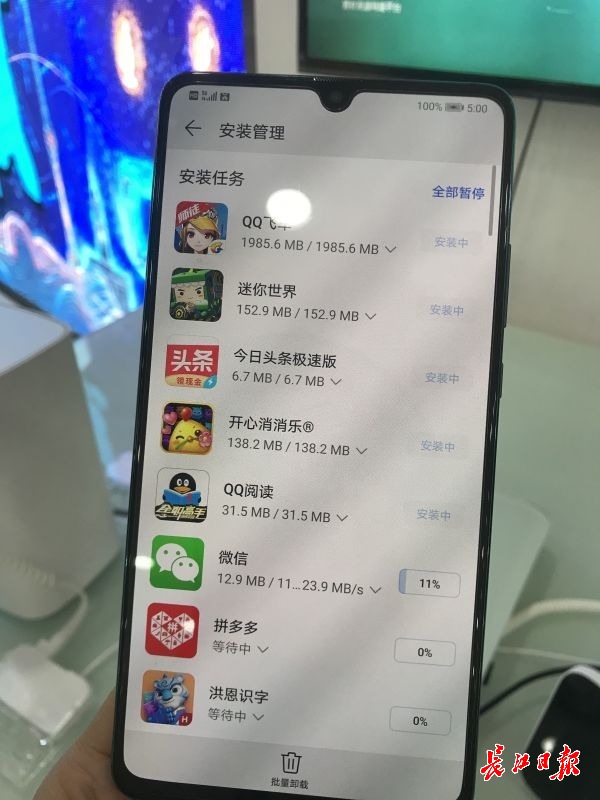 随后他和营业厅工作人员又尝试下载多款游戏软件,胡先生看到,存储为2G大小的游戏软件下载耗时只需16秒左右。“以后打游戏、下载APP都将没有延时,用户体验越来越爽”,胡先生感慨。
