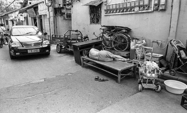 拍这组照片时,陈思正在街上闲逛。看着一中年男人架着个竹床往外走,便好奇地跟了上去。竹床摆好,男男女女端来菜肴,原来是已搬离的老邻居们约着回老宅叙叙旧。如果你有心,这些老武汉人小时候的回忆,还可以找到踪迹。 2017年夏季,陈思路过唯一保留清朝石板路的药帮一巷,恰巧遇到一位小男孩站在桶里洗澡,男孩看着他,他定焦男孩。