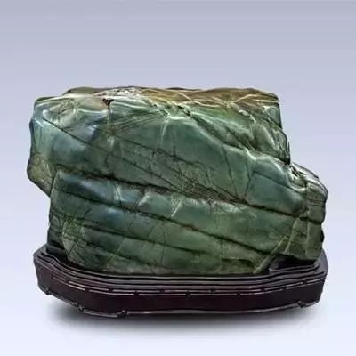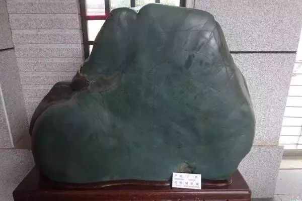 彩陶石以绿彩陶为上品,豆绿色最佳。奇石馆所藏另一块彩陶石正是标准的额豆绿色,色泽水准还在“中流砥柱”之上。除色彩可人外,竖纹少而横纹鲜明,线条富于动感,在彩陶石中并不多见。