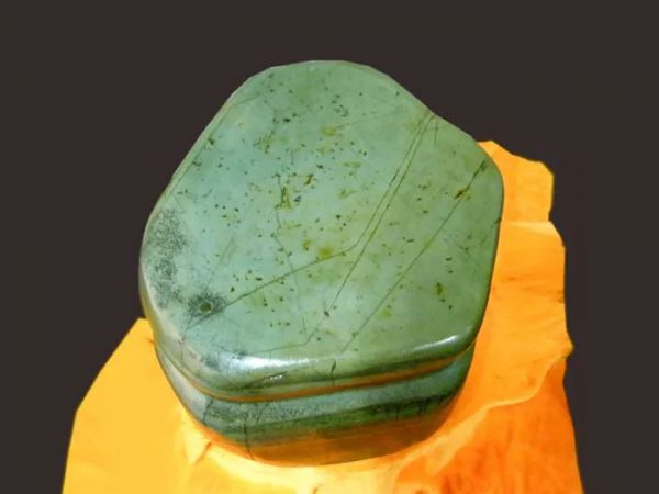 彩陶石,又称马鞍石,产于柳州合山市。由于石色有翠绿、墨黑、橙红、棕黄等色,如彩色釉彩陶瓷,故此得名。广西当地传说,触摸一下彩陶石可以给人带来好运,加之这种石头优美的光泽色彩,近年来逐渐在奇石收藏圈中大放异彩。