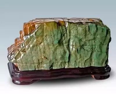 彩陶石中还有一类名为“鸳鸯彩陶”,取名自鸳鸯的羽毛色彩灿烂鲜明。奇石馆所藏的一块鸳鸯彩陶石,其上部为上乘的豆绿色,下部为黑色釉光,色调沉静浓郁,对比鲜明。横纹流畅如波浪,竖纹少而对称。