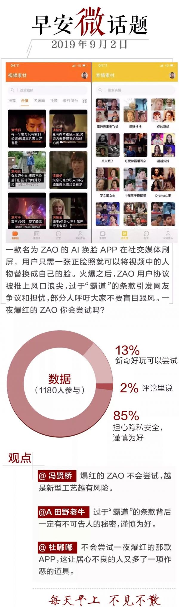 ZAO换脸软件刷屏后,其用户协议被指霸道,用户担心个人隐私会被泄露。ZAO昨日修改用户协议,删除原有的上传肖像权可被ZAO完全免费、不可撤销、永久、可转授权和可再许可的权利等描述。但依然保留“您同意对用户内容进行网络信息传播的权利”。