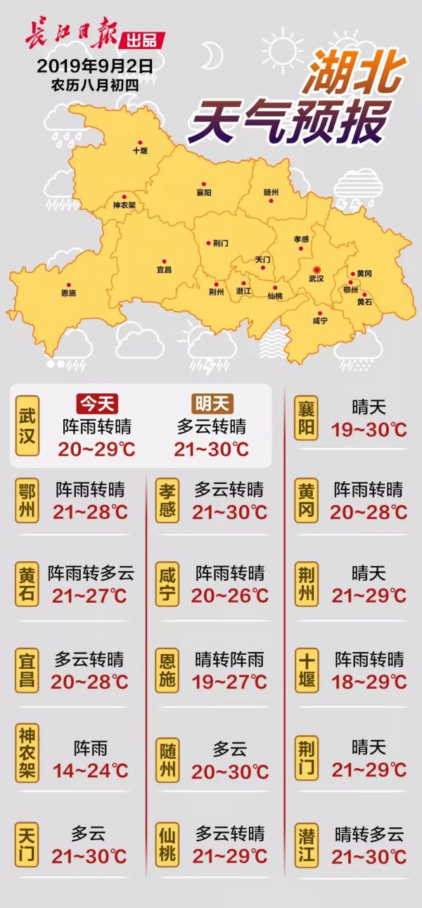 武汉在清凉中迎来9月。气象台预计,未来三天,武汉市以多云天气为主。市内最高气温会重新爬上30℃,而最低气温则维持在20~21℃。