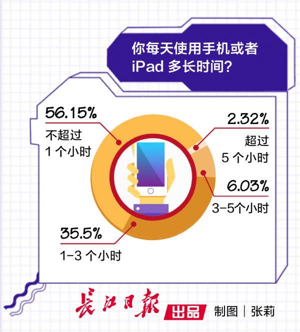 此次调查显示,58.7%的小学生拥有个人专属的智能手机或iPad,手机或iPad已经成为许多小学生的“玩伴”“学伴”。60.09%的家长对孩子使用手机等电子产品有时间限制,36.66%的家长仅允许孩子用于学习,只有3.25%的家长对电子产品没有任何限制,随时可用。