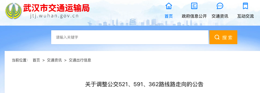 武汉市交通运输局网站信息显示,此次调整涉及的公交线路为521路、591路、362路。调整方案具体如下: