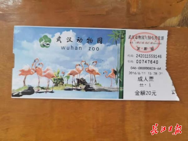 2016年武汉动物园门票。(记者郭可滢 供图)