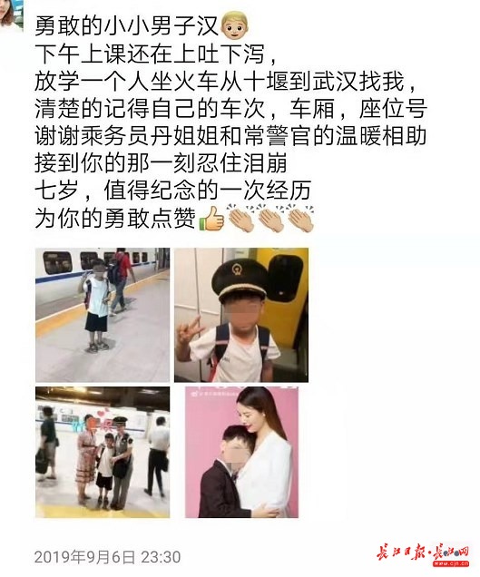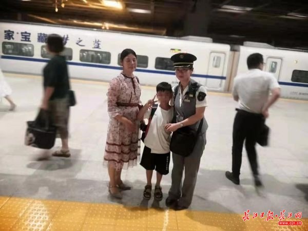 9月6日下午,朱女士委托十堰的朋友将孩子一个人送上十堰开往武汉的D5246次火车。按规定,铁路运输企业一般不接受儿童单独乘车,得知小朋友的情况后,十堰车站派出所站警常全周护送孩子进站,交给动车列车长。
