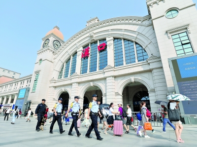 三大火车站增派警力,保障旅客平安。图为民警在汉口火车站巡逻