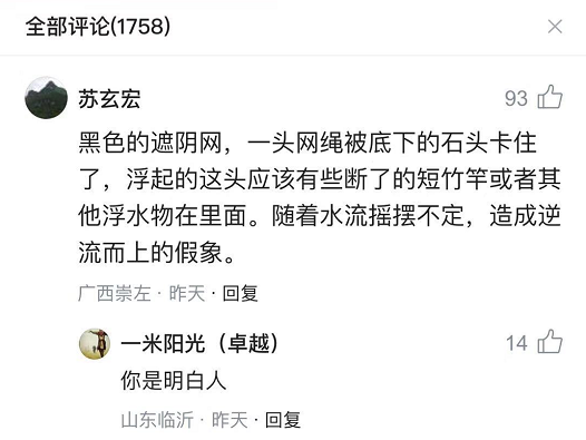 另一位来自中科院的水生生物研究人员表示,可能就是一个被什么东西挂住的黑色塑料袋。视频中,它虽然在摆动,但一直没有前行。