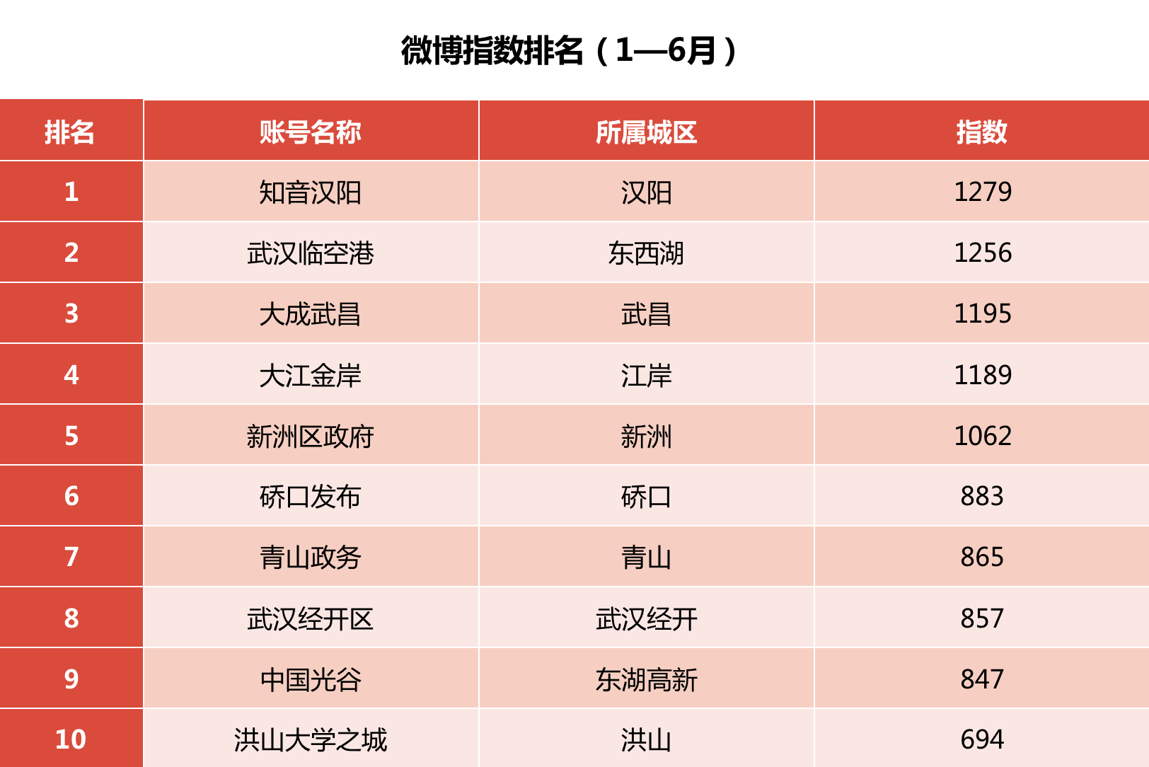 城区微博指数2022年半年度排名前三的分别是知音汉阳、武汉临空港和大成武昌。微博传播力指数包含各微博发稿量、转发、评论、点赞数。