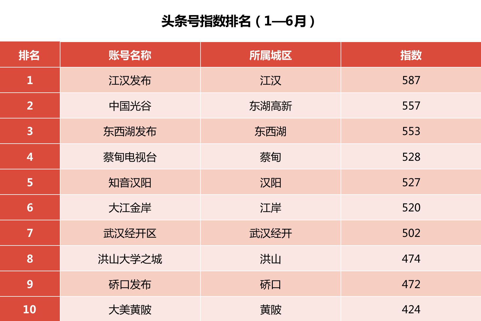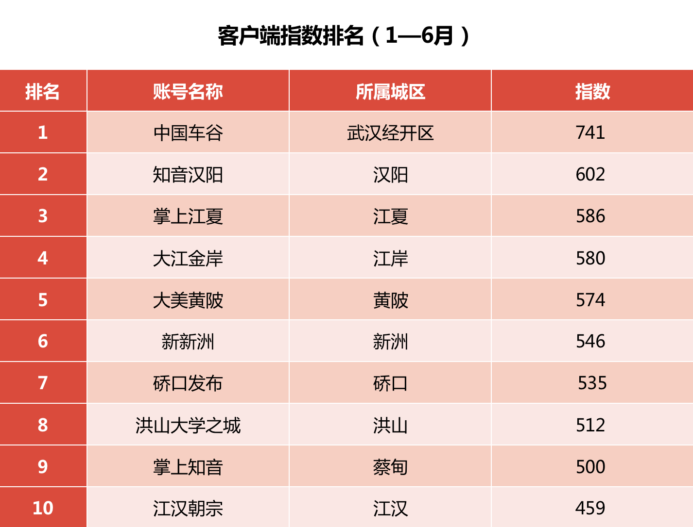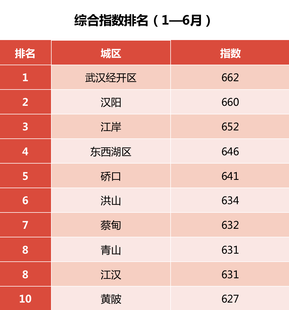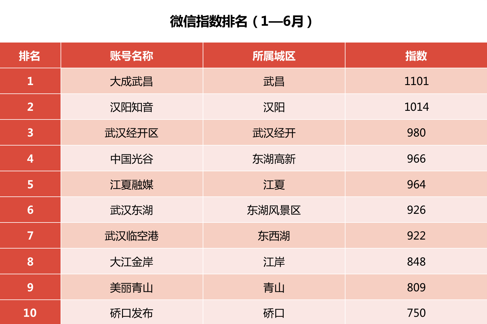 在此次公布的大武汉城区融媒体传播力指数排行榜2022年半年度综合榜中,武汉经开区位列第一,汉阳区、江岸区分列第二、第三。