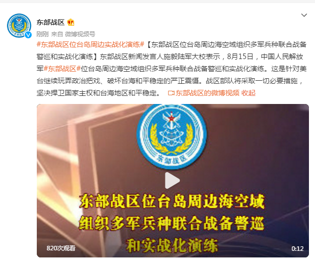 东部战区新闻发言人施毅陆军大校表示,8月15日,中国人民解放军东部战区位台岛周边海空域组织多军兵种联合战备警巡和实战化演练。这是针对美台继续玩弄政治把戏、破坏台海和平稳定的严正震慑。战区部队将采取一切必要措施,坚决捍卫国家主权和台海地区和平稳定。