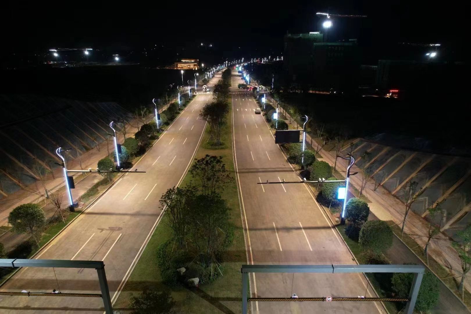 这些智慧共杆由美格科技设计承建,不仅外形酷炫,灯头内嵌半透明的太阳能板,而且还是未来三路的“智慧化”担当,配备有交通诱导屏、智慧路灯、LED电子广告屏、公共广播系统以及全光网络。