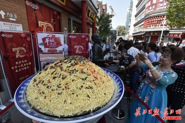 活动现场,武汉老字号蔡林记传承人王永中推出的超级大碗“国庆面”样品正式亮相。一个重达200斤的大碗,一次性可以装满120斤面条,足够300多人享用,吸引了现场不少市民围观拍照,新推出的“国庆面”也引来了不少市民尝鲜。