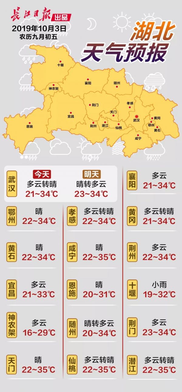 10月3日至4日,武汉升温的势头还在继续,特别是白天,市内高温将达35℃。据最新气象资料分析,天气的转折点出现在10月5日,届时冷空气会重新登场,最高气温也将迅速跌落至30℃以下。