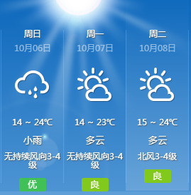8日:阴天到多云,偏北风3级, 16~25℃。9日:阴天到多云,偏北风2到3级, 18~27℃。10日:多云转小雨,偏北风3级, 18~28℃。11日:阴天有小雨,偏北风3级, 18~24℃。12日:阴天有小雨,偏北风3到4级,阵风5级, 16~23℃。